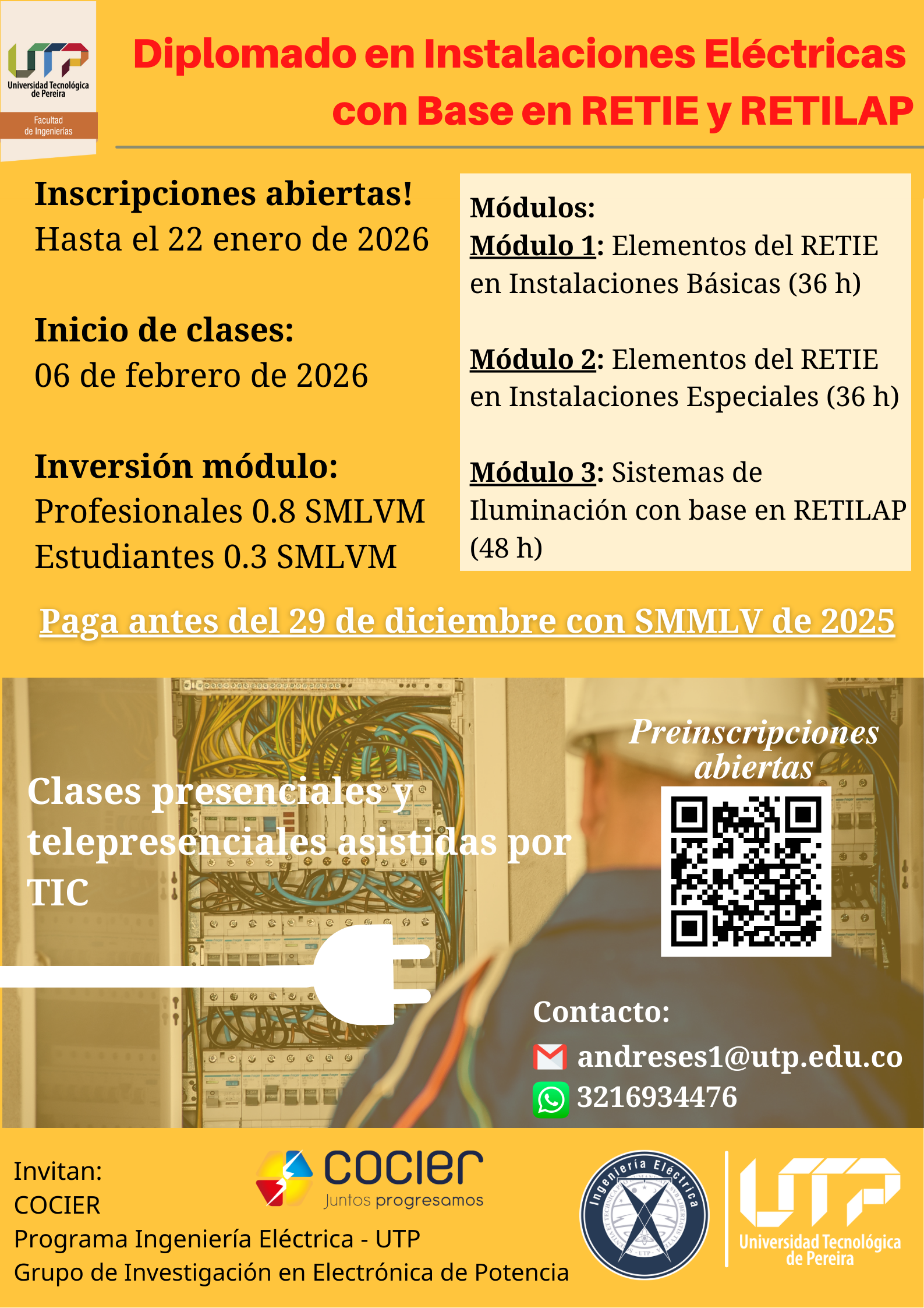 La NTC 2050, el RETIE, RETILAP, la norma internacional NFPA 70E, son considerados instrumentos técnico-legales en Colombia que permiten garantizar que las instalaciones, equipos y productos usados cumplan los objetivos de seguridad eléctrica y desempeño. El conocimiento, actualización, interpretación y aplicación de las normas y reglamentos establecidos para las instalaciones eléctricas, es de gran importancia para los profesionales de la ingeniería eléctrica y afines. El programa de Ingeniería Eléctrica de la Universidad Tecnológica de Pereira, pone a disposición sus capacidades para brindar formación continua en temas que permiten el fortalecimiento de las habilidades profesionales.